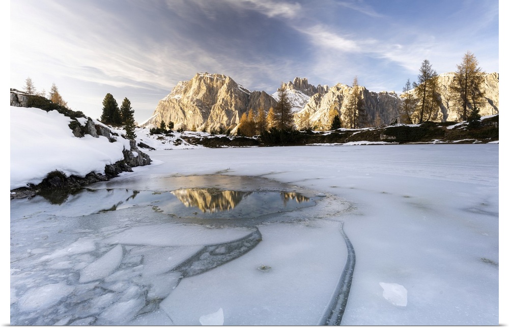 <p>Lagazuoi mountain mirrored in the icy lake Limides at dawn, Ampezzo Dolomites, Belluno province, Veneto, Italy, Europe</p>