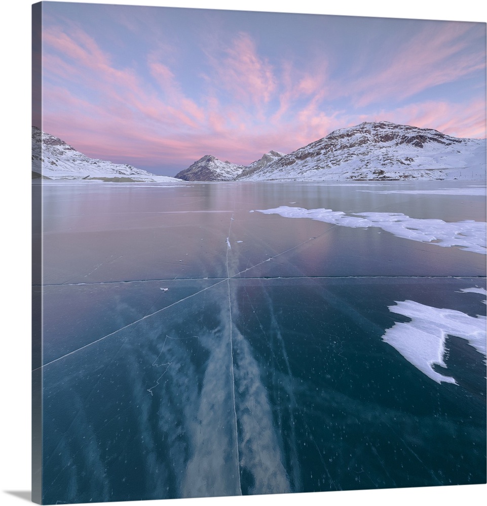 <p>Panorama of the frozen Lago Bianco framed by pink clouds at dawn, Bernina Pass, canton of Graubunden, Engadine, Switzerland</p>