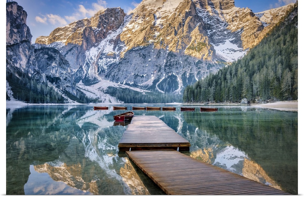 <p>Lago di Braies and row boats at sunrise in the Dolomites</p>