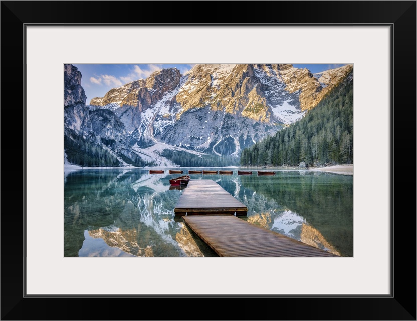 <p>Lago di Braies and row boats at sunrise in the Dolomites</p>