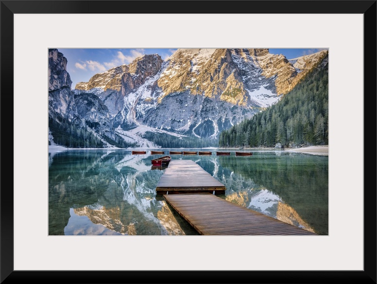 <p>Lago di Braies and row boats at sunrise in the Dolomites</p>