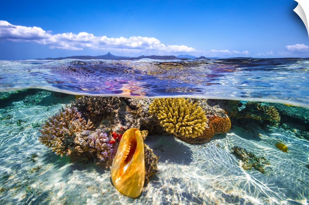<p>A beautiful landscape, the lagoon of Mayotte contains unsuspected treasures. In the foreground, a magnificent shell "iron" (cassis cornuta) that is protected in mayotte.</p>