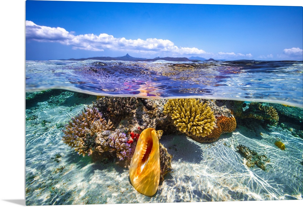 <p>A beautiful landscape, the lagoon of Mayotte contains unsuspected treasures. In the foreground, a magnificent shell "iron" (cassis cornuta) that is protected in mayotte.</p>