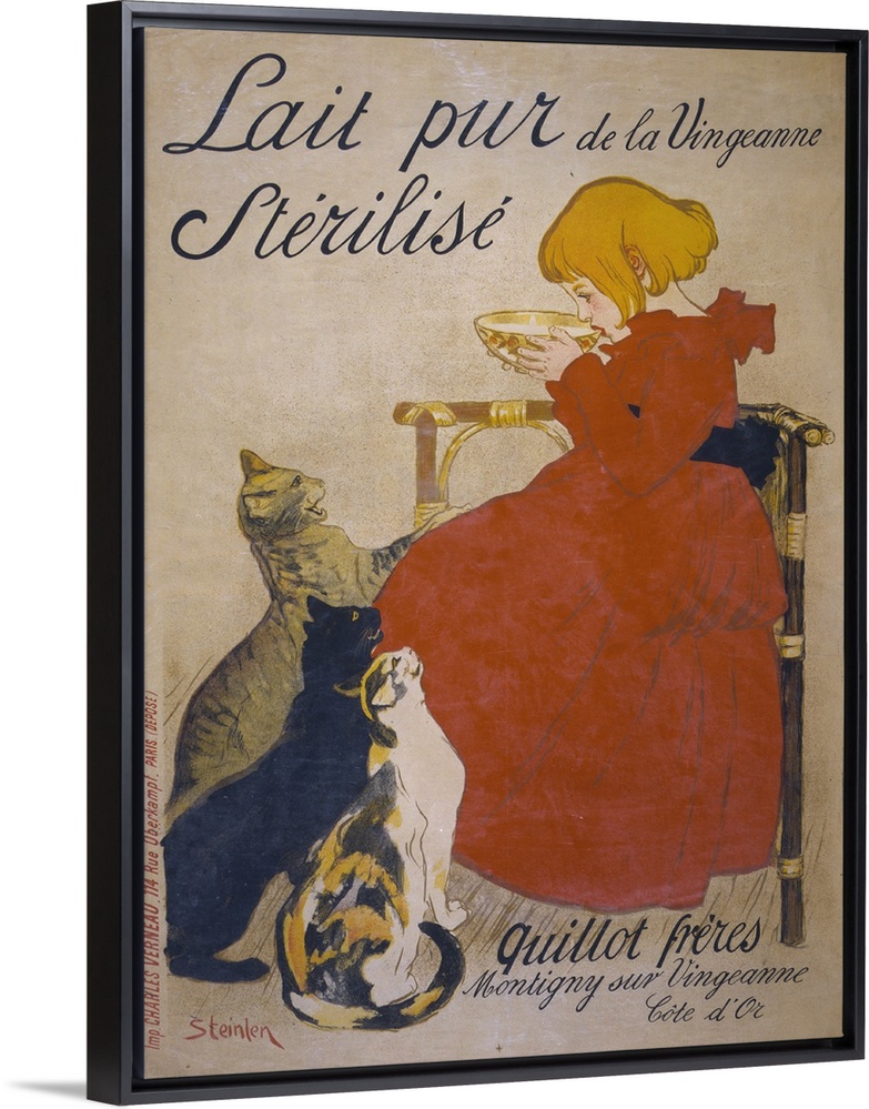 <p>Lait Pur Sterilise De La Vingeanne, girl drinking milk from a bowl with cats begging, by Theophile Alexandre Steinlen, Paris, France, 1895. lc-uszc4-11932</p>