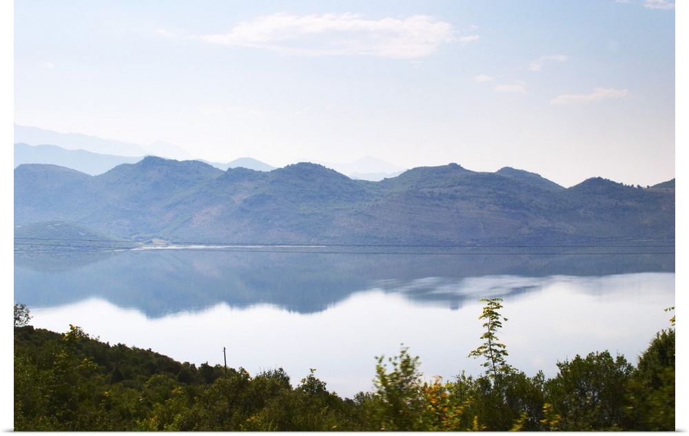 <p>View over the vast lake and marshland Skadarsko Jezero on the border between Montenegro and Albania. Mountains in Albania on the far side. Montenegro, Balkan, Europe.</p>