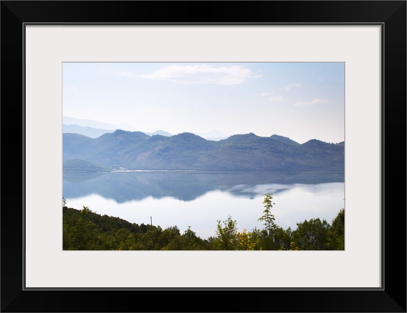 <p>View over the vast lake and marshland Skadarsko Jezero on the border between Montenegro and Albania. Mountains in Albania on the far side. Montenegro, Balkan, Europe.</p>