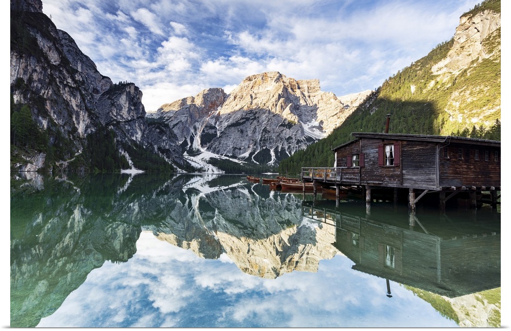 <p>Lake Braies (Pragser Wildsee) at sunrise with Croda del Becco mountain reflected in water, Dolomites, South Tyrol, Italy, Europe</p>