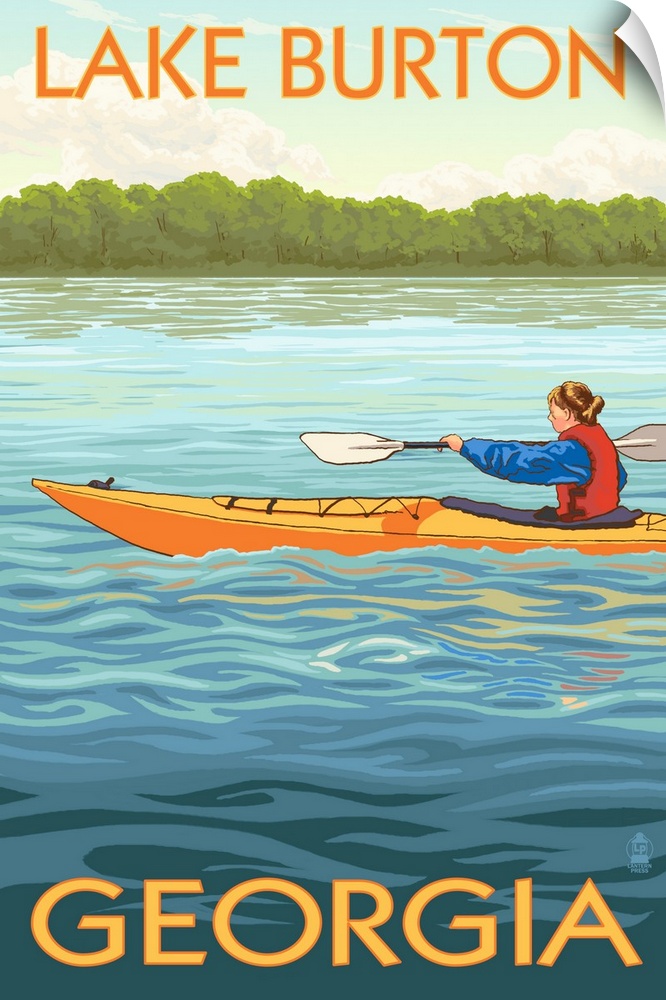 <p>Retro stylized art poster of a woman in a kayak paddling in clear blue water.</p>