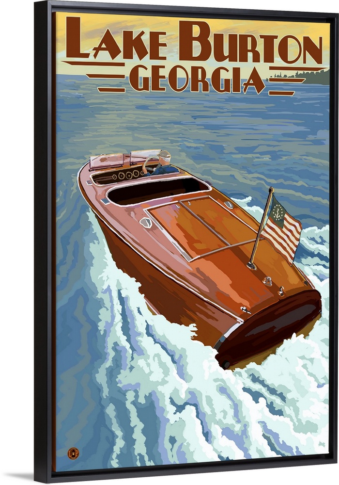 <p>Retro stylized art poster of a wooden speed boat on the water.</p>