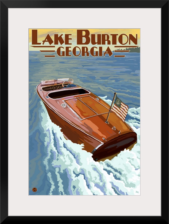 <p>Retro stylized art poster of a wooden speed boat on the water.</p>