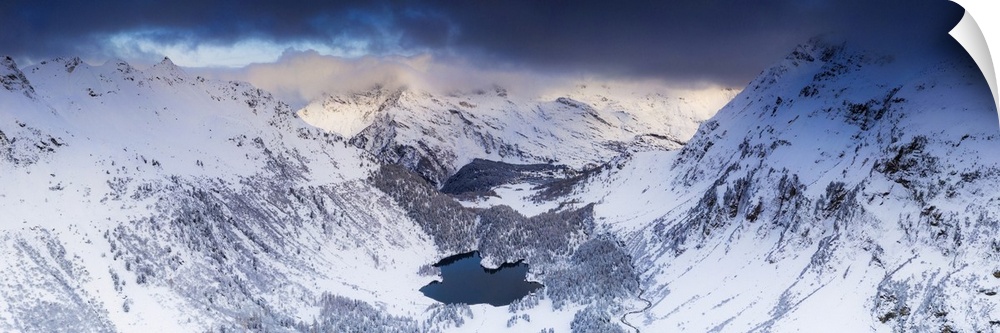 <p>Aerial panoramic of Lake Cavloc and snowy woods, Bregaglia Valley, Engadine, canton of Graubunden, Switzerland, Europe</p>