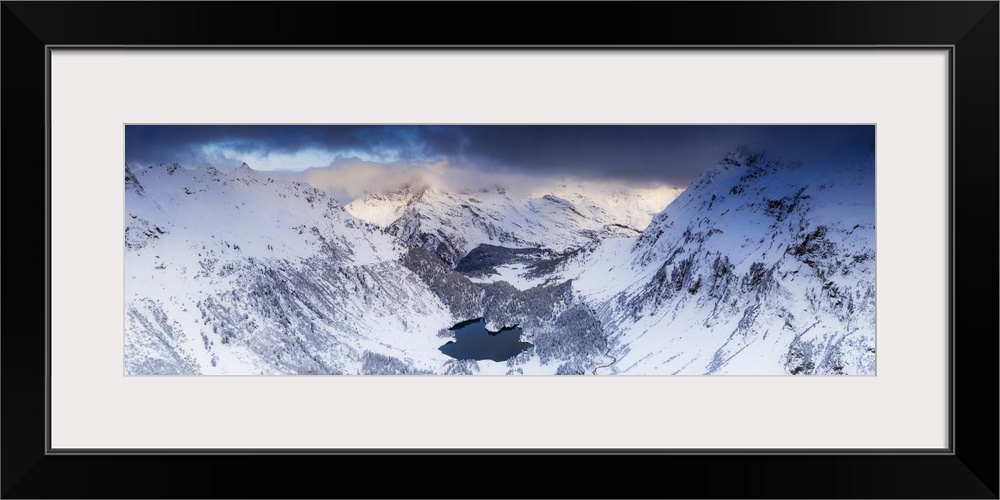 <p>Aerial panoramic of Lake Cavloc and snowy woods, Bregaglia Valley, Engadine, canton of Graubunden, Switzerland, Europe</p>