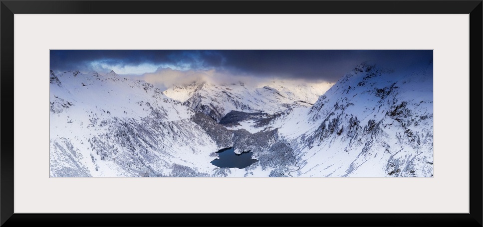 <p>Aerial panoramic of Lake Cavloc and snowy woods, Bregaglia Valley, Engadine, canton of Graubunden, Switzerland, Europe</p>