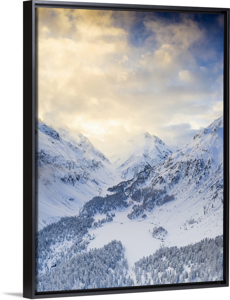 <p>Aerial view of Lake Cavloc and woods covered with snow, Bregaglia Valley, Engadine, canton of Graubunden, Switzerland, Europe</p>