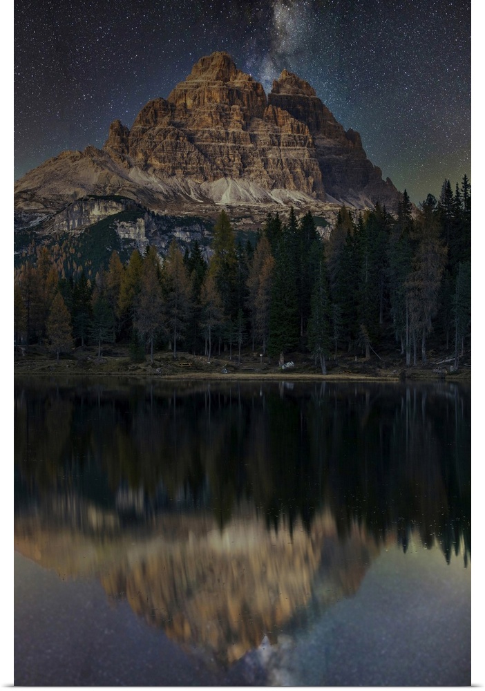 <p>Lake d'Antorno with Tre Cime di Lavaredo mountain group under a starry night, Misurina, Veneto, Italy.</p>