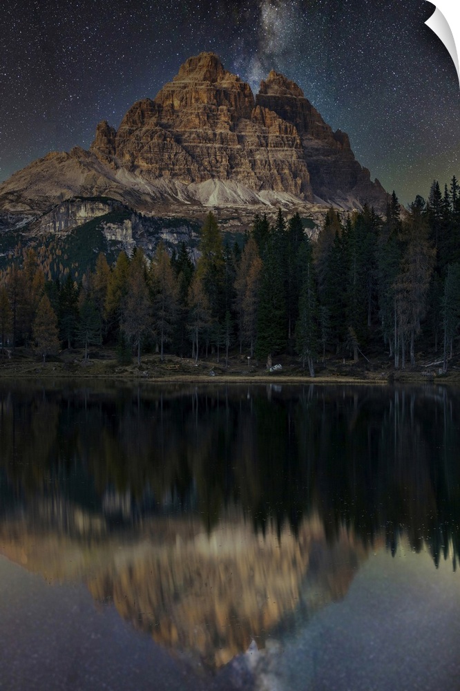 <p>Lake d'Antorno with Tre Cime di Lavaredo mountain group under a starry night, Misurina, Veneto, Italy.</p>