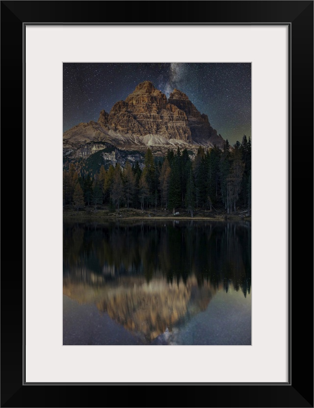 <p>Lake d'Antorno with Tre Cime di Lavaredo mountain group under a starry night, Misurina, Veneto, Italy.</p>