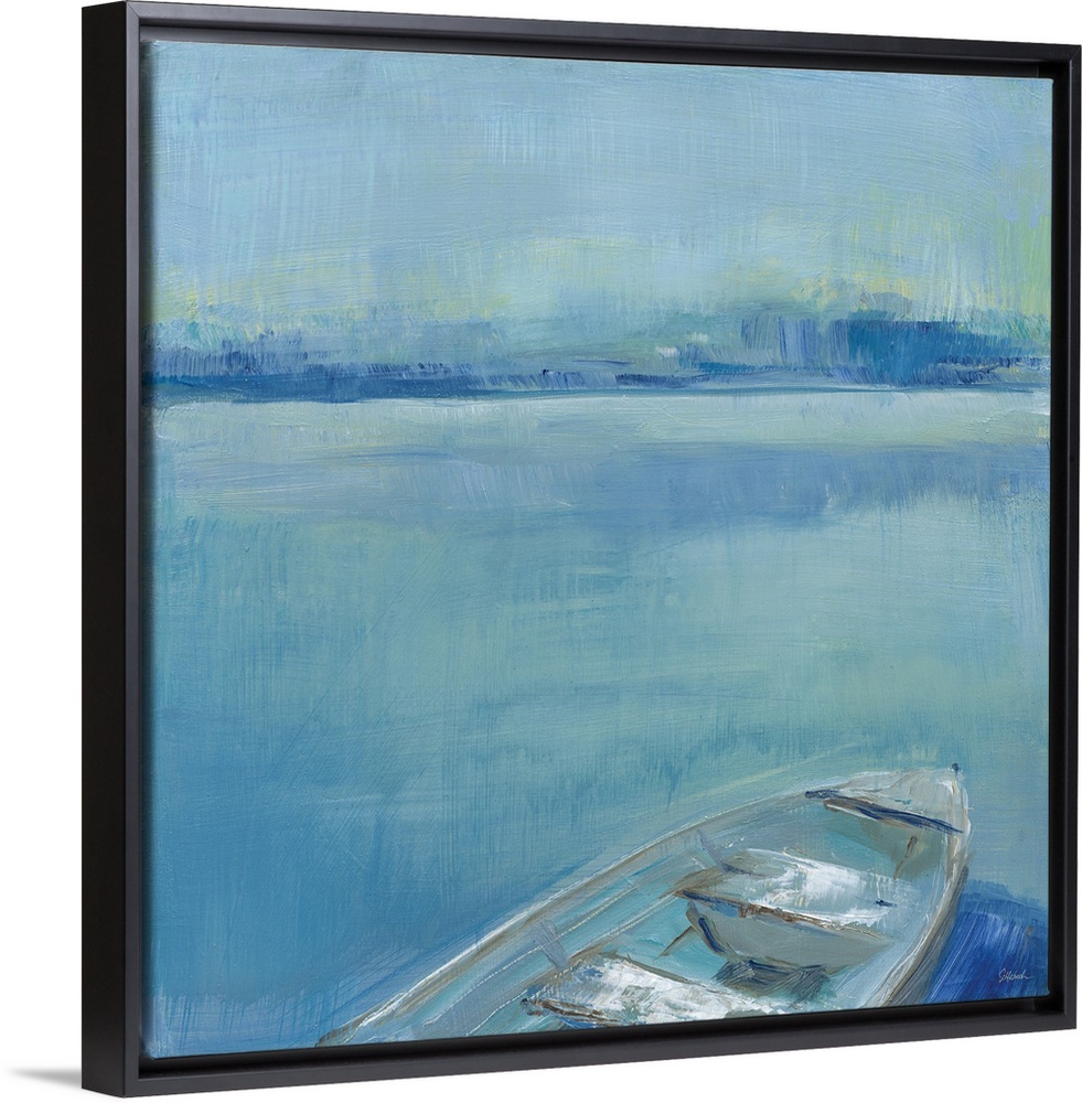 <p>Energetic brush strokes create a serene lake landscape with a rowboat floating in the water in this contemporary artwork.</p>