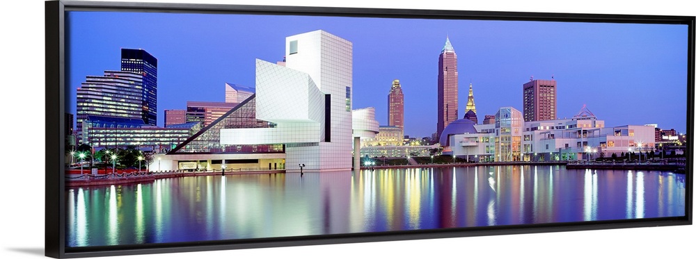 <p>Large, panoramic photograph of the Cleveland skyline at dusk, reflecting in the waters of Lake Erie.</p>