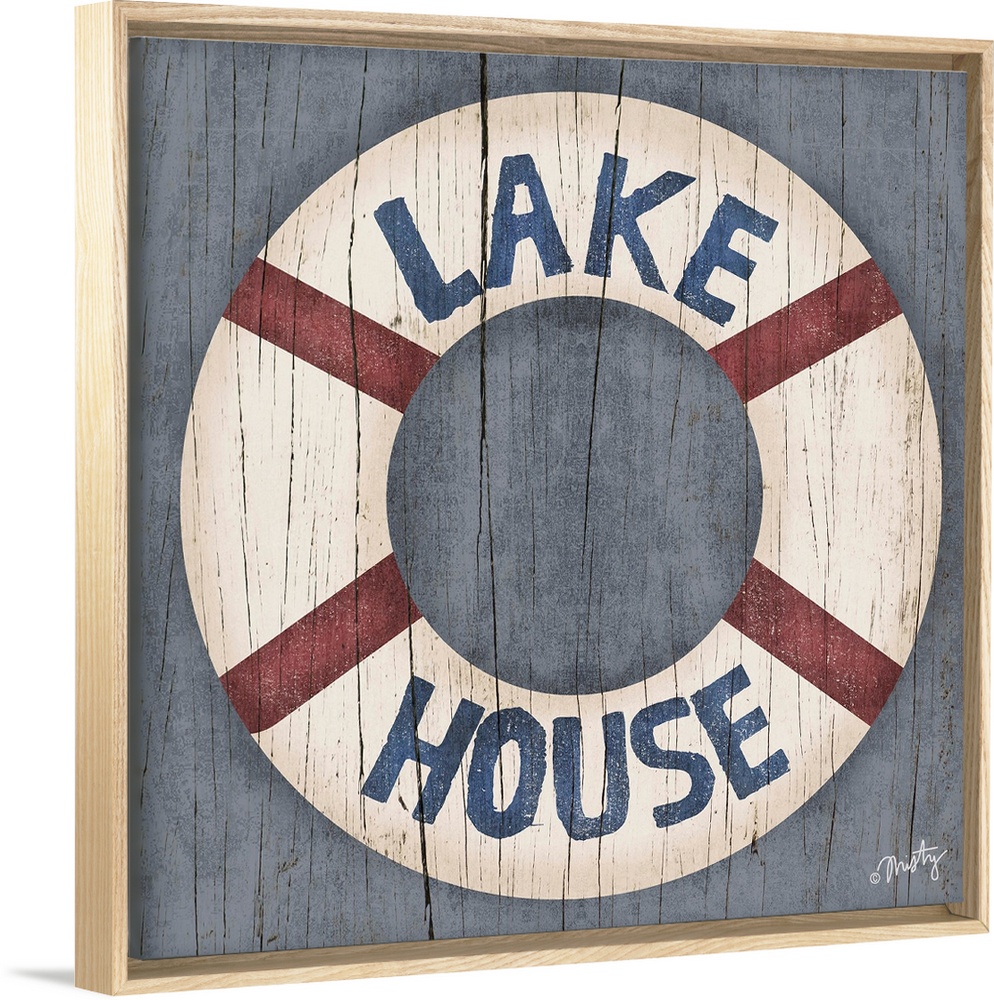 <p>This decorative artwork of a ring buoy features the words, Lake House, over it with a cracked wood texture running throughout.</p>