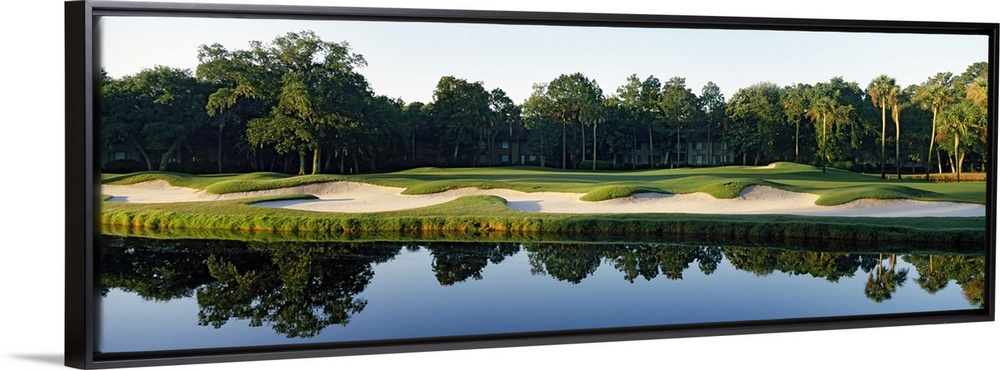<p>Reflection of an urban forest in still waters at the edge of a sand trap in a Southern US town.</p>