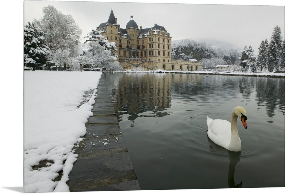 <p>A mute swan swims in a pond in the winter near a large historic building in Europe, covered in snow.</p>