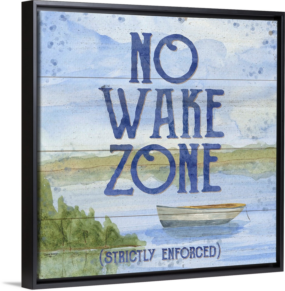 <p>"No Wake Zone (Strictly Enforced)" and a watercolor painting of a boat on a lake with a wood panel effect.</p>
