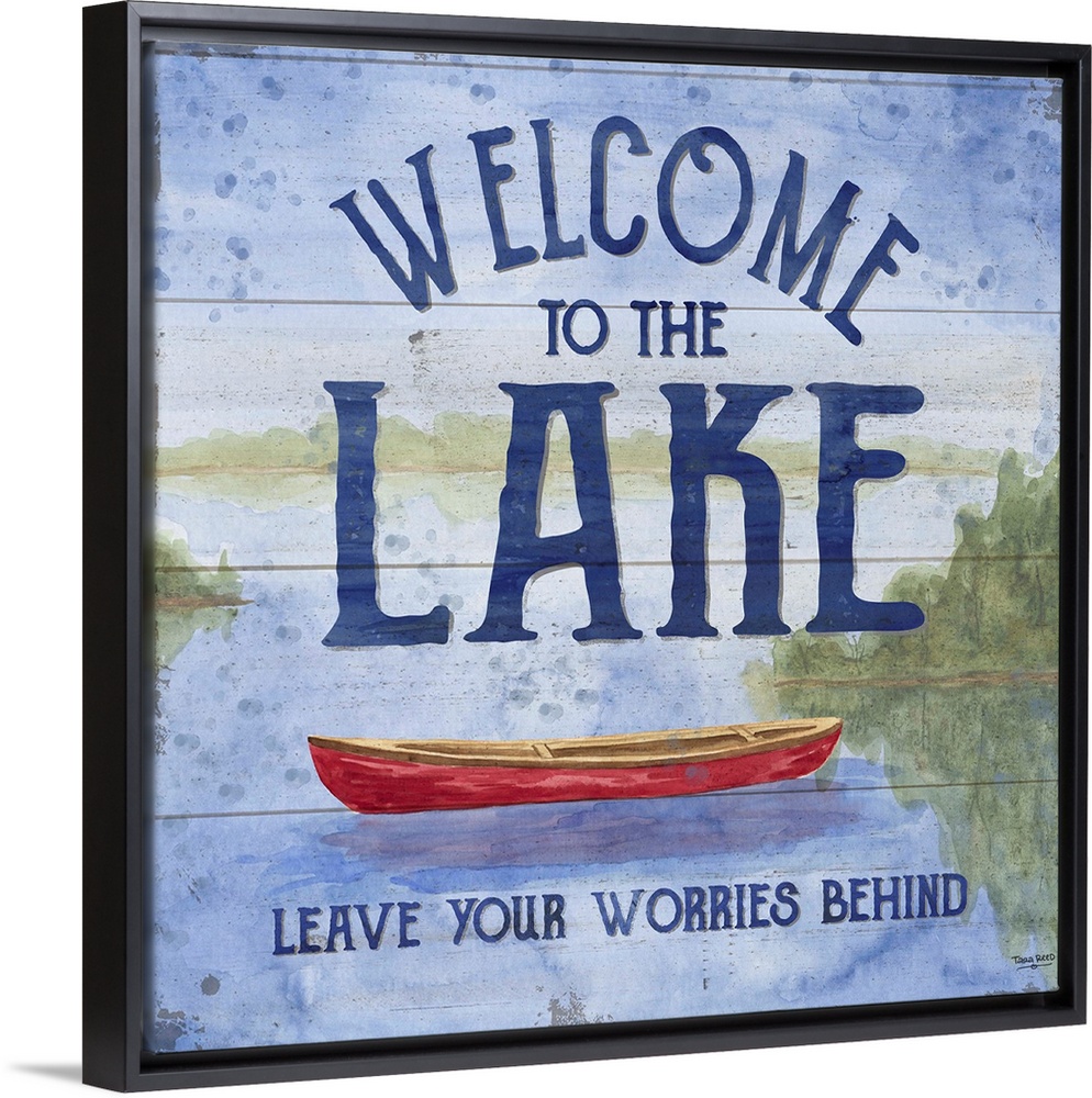 <p>"Welcome To The Lake, Leave Your Worries Behind" and a watercolor painting of a boat on a lake with a wood panel effect.</p>