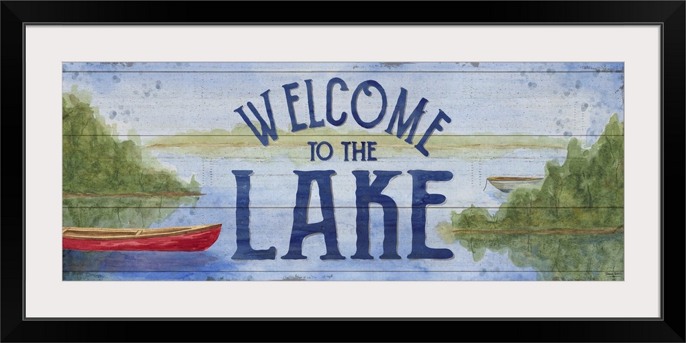 <p>"Welcome To The Lake" and a watercolor painting of a boat on a lake with a wood panel effect.</p>