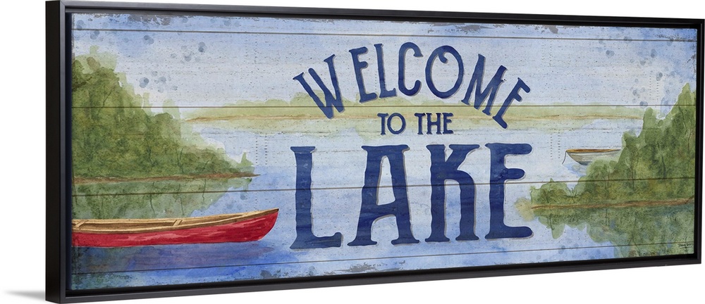 <p>"Welcome To The Lake" and a watercolor painting of a boat on a lake with a wood panel effect.</p>