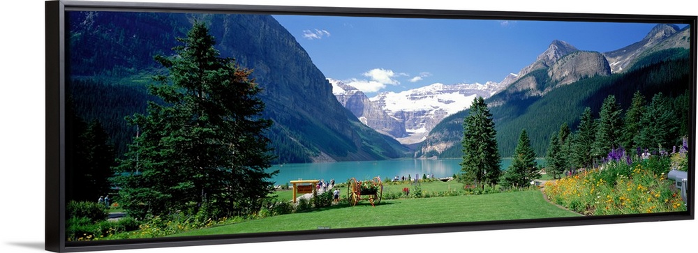 <p>Panoramic wall docor of a smooth lakefront surrounded by rolling hills and snow capped mountains in the background.</p>