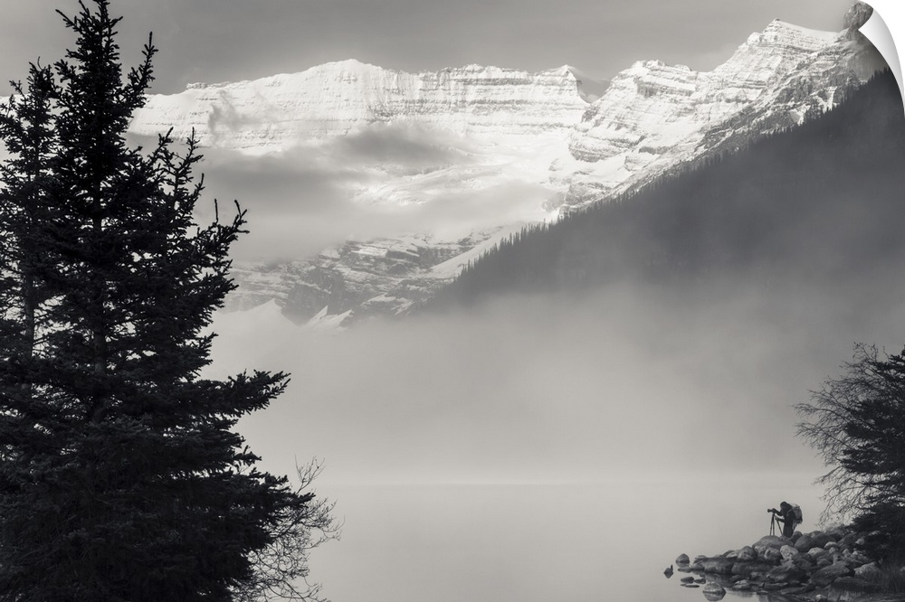 <p>Silhouette of a photographer on the shore of Lake Louise with fog rising from the lake at sunrise, Banff National Park; Lake Louise, Alberta, Canada</p>