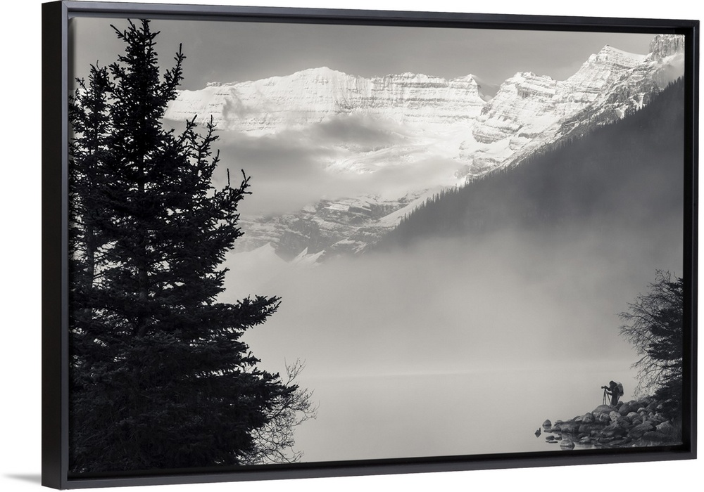 <p>Silhouette of a photographer on the shore of Lake Louise with fog rising from the lake at sunrise, Banff National Park; Lake Louise, Alberta, Canada</p>