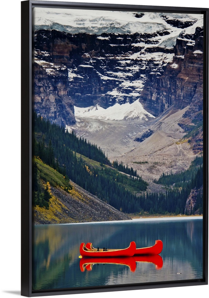 <p>Lake Louise, British Columbia Canada. Red canoe on the lake in front of glacier & snowy mountains.</p>