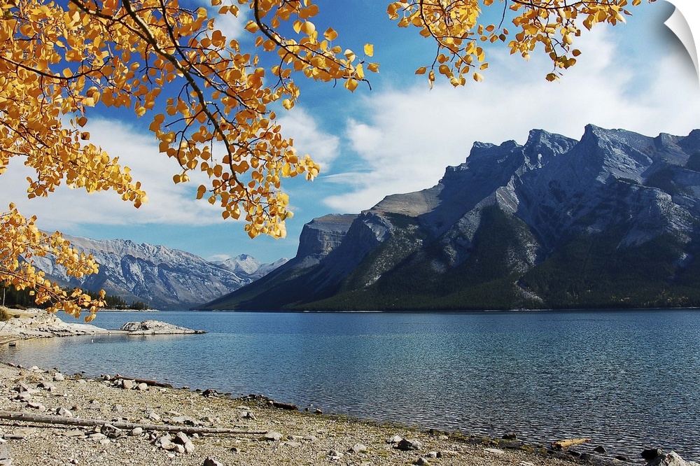 <p>Lake at canadian rocky mountains, framed with autumn leaves, Canada.</p>