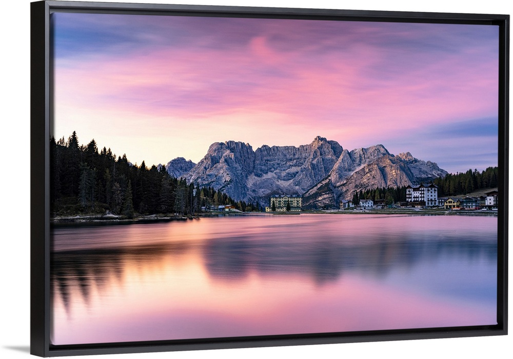 <p>Romantic pink sky at dawn over lake Misurina and Sorapiss mountain peak in autumn, Dolomites, Belluno province, Veneto, Italy</p>
