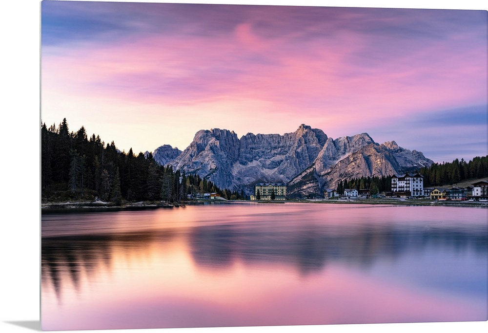 <p>Romantic pink sky at dawn over lake Misurina and Sorapiss mountain peak in autumn, Dolomites, Belluno province, Veneto, Italy</p>