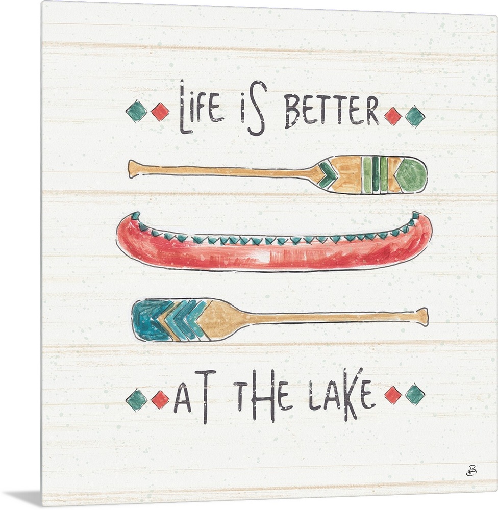 <p>A decorative design of a canoe and oars with the text "Life Is Better At The Lake". There are faded vertical brown lines through out the image.</p>