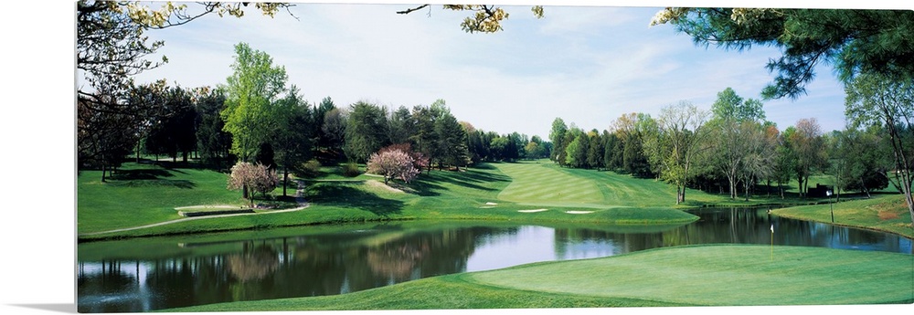<p>Panoramic photograph of golf course featuring putting green, sand traps, and winding pond. There are various trees and on the green that are reflected in the pond.</p>