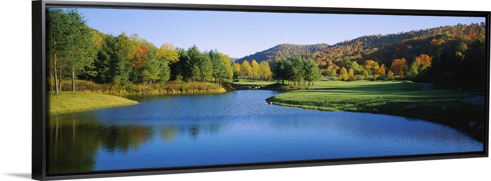 <p>Long horizontal canvas print of a golf course with a lake in the middle and fall foliage on rolling hills in the background.</p>