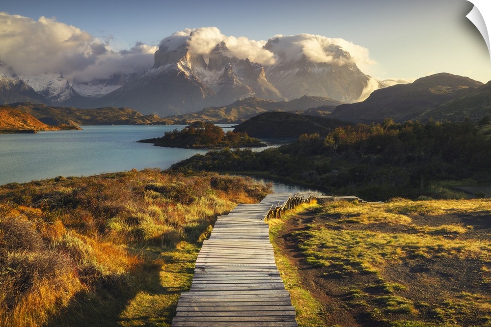 <p>Lake Pehoe and Cuernos del Paine in the background, Torres del Paine NP, Ultima Esperanza, Region de Magallanes y de la Antartica Chilena, Patagonia, Chile.</p>