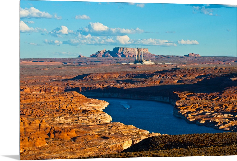 <p>North America, USA, Arizona, Page, Lake Powell Vistas, cruising Boat, From Wahweap Overlook.</p>