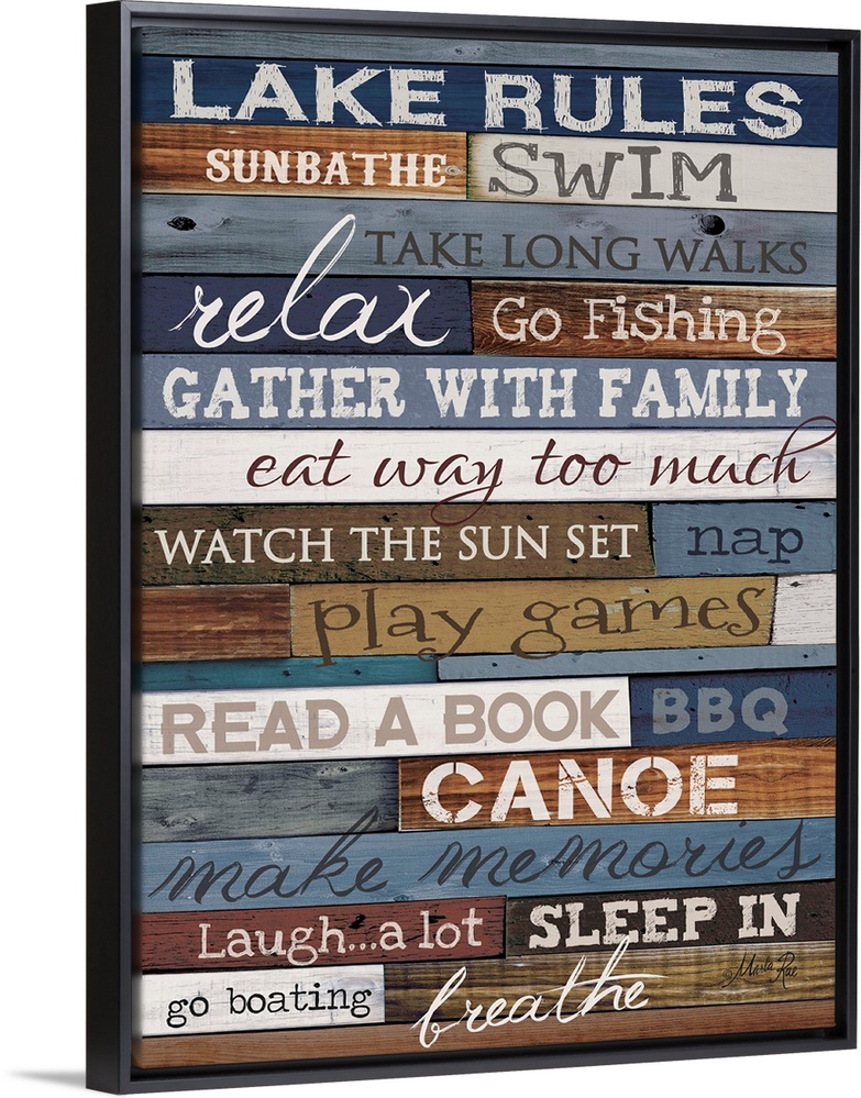<p>Typography artwork of lake rules, with text against a wooden background.</p>
