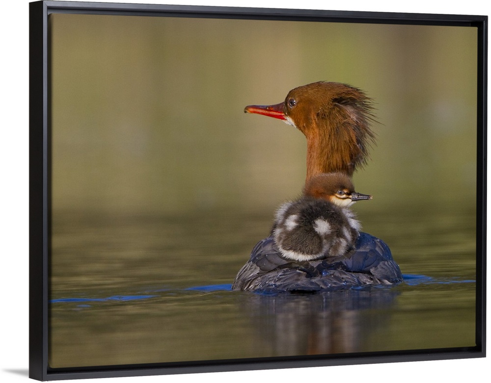 <p>USA, Lake Sammamish, Washington. Female Common Merganser with chick on back.</p>