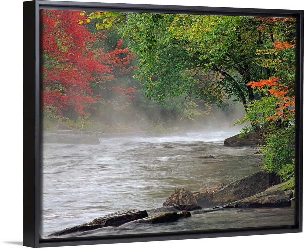 <p>Fall colored trees line a stream of rushing water with a thin layer of fog just above it.</p>