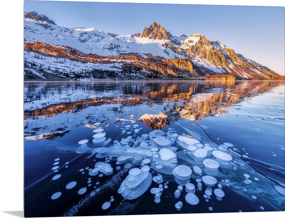 <p>Lake Sils covered of ice bubbles at sunset, canton of Graubunden, Engadine, Switzerland</p>