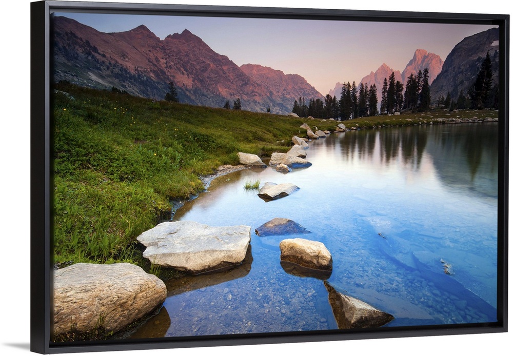 <p>Evening light over mountains of Teton Range reflected on still waters of Lake Solitude.</p>