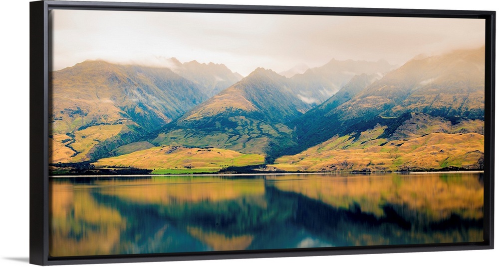 <p>Landscape photograph of a lake with Autumn covered mountains in the background and a foggy top.</p>