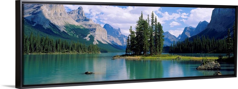 <p>A peninsula with a grove of conifer trees protrudes into this scenic body of water surrounded by mountains of the Canadian Rockies.</p>