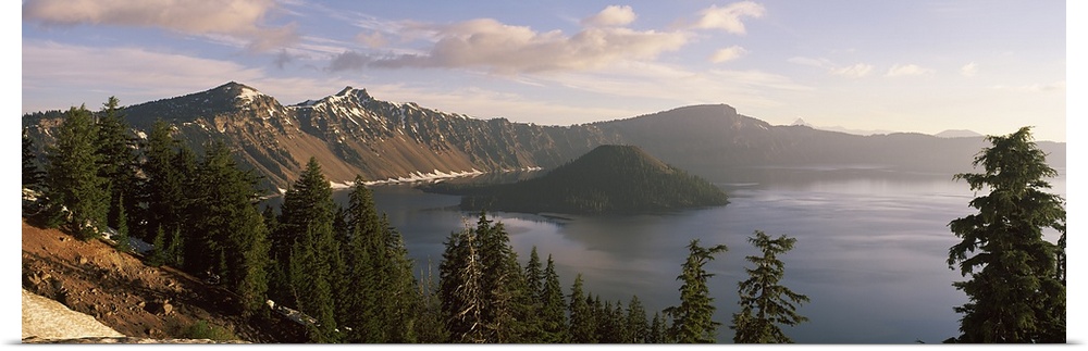 <p>Lake surrounded by mountains, Wizard Island, Crater Lake National Park, Oregon, USA</p>